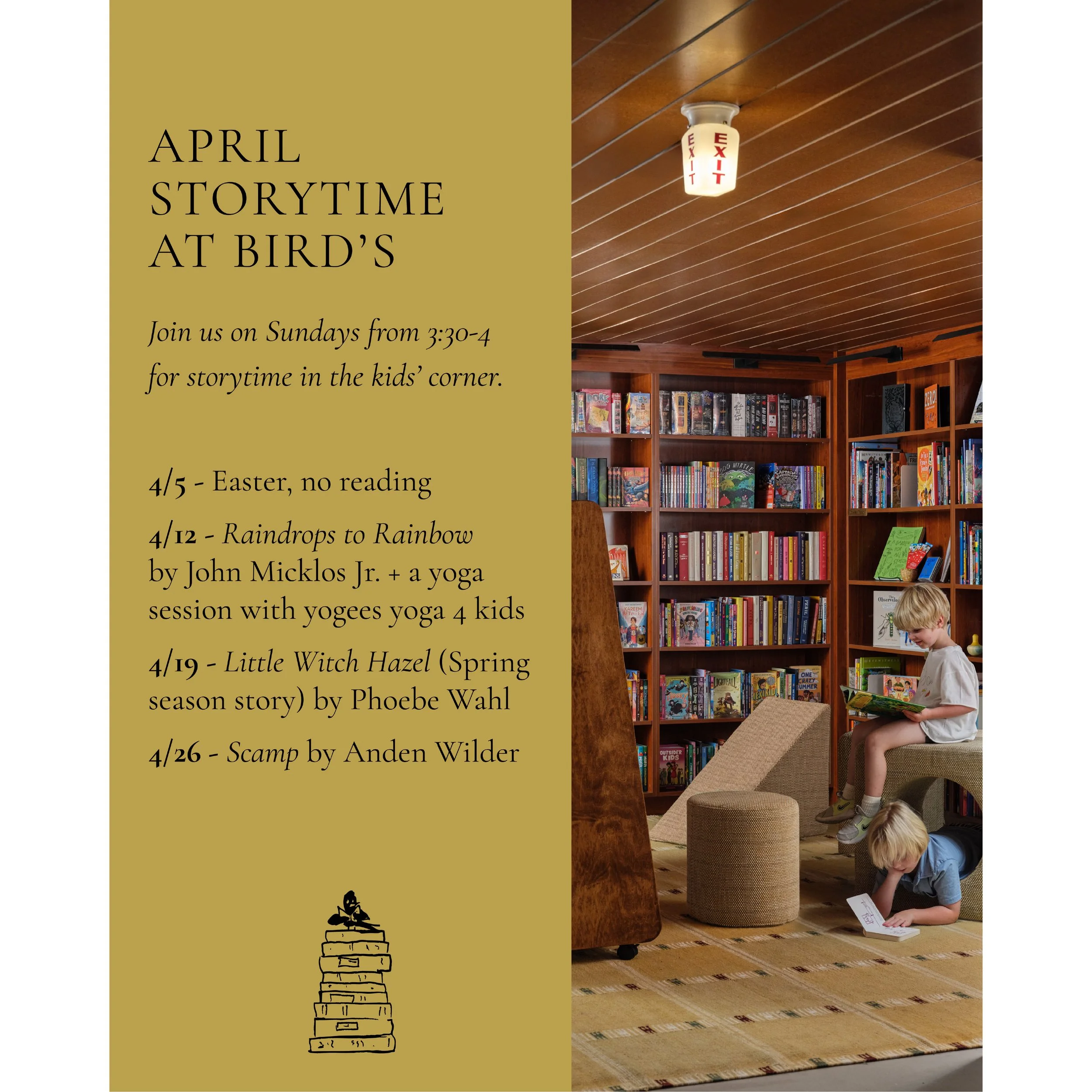April 12th is an especially exciting Sunday, because we are teaming up with yogees yoga 4 kids for a storytime and yoga session! yogees yoga 4 kids teach engaging yoga classes that foster a sense of calm and focus while promoting physical well-being. They are Registered Children's Yoga School (RCYS) and offer specialized children's yoga training programs. Note: this combined session will take about 30 minutes in total.
